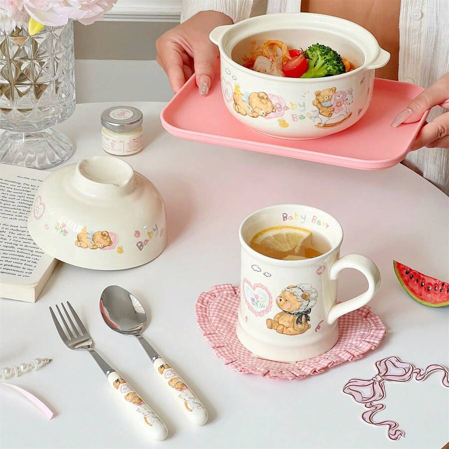 1 Set Of Cute And Heartwarming Thanksgiving Bear Patterned Exquisite Ceramic Covered Bowls With Lids, Forks And Spoons, Plus A Mug Set. Perfect For Solo Dining And Comforting Instant Noodle Dinners. Ideal As A Gift For Friends, Family, And Children. Great For Thanksgiving, Halloween.