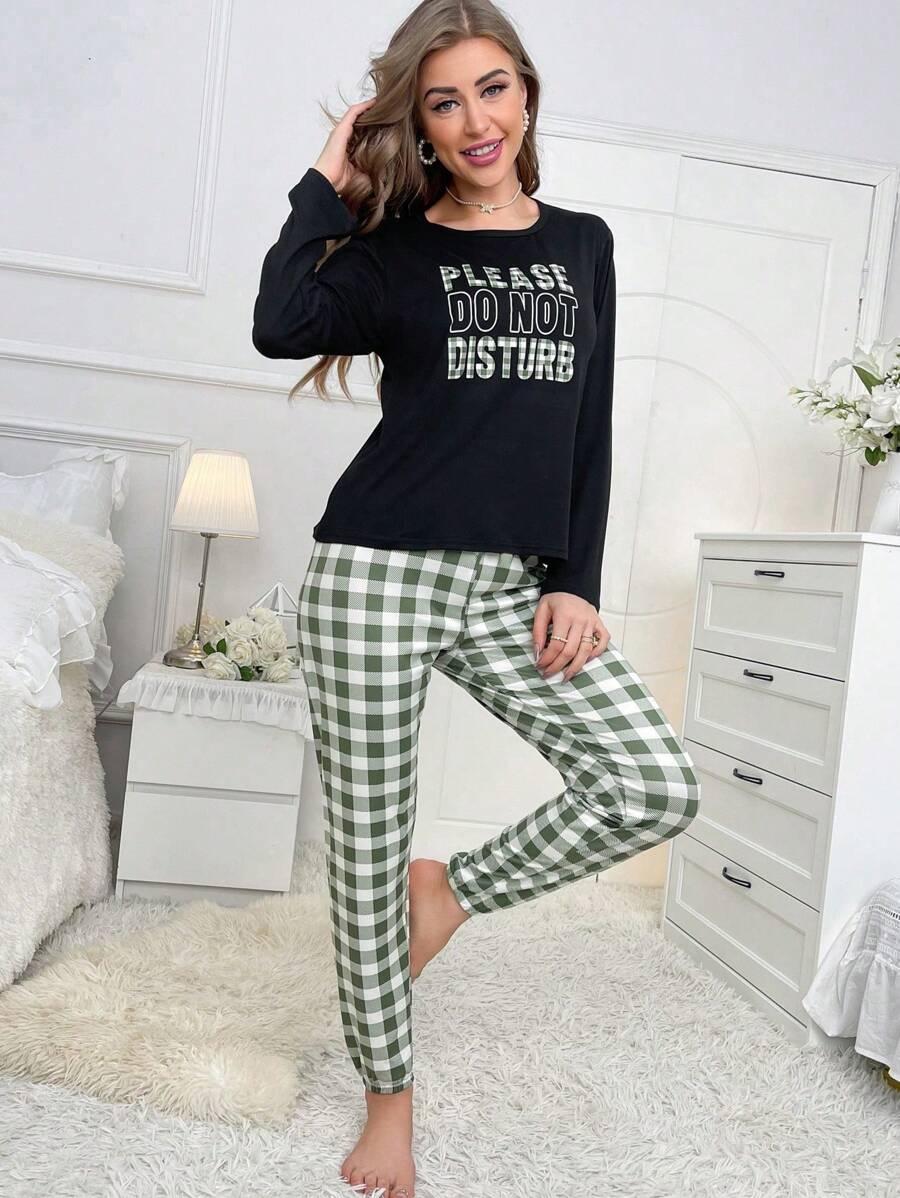 2pcs Women's Casual Letter & Plaid Print Crew Neck Long Sleeve Pajama Set, Autumn & Winter