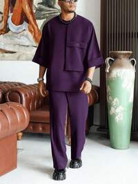 Disqoir2pcs/Set 2025 New Men's Dashiki Set, Solid Color Long Sleeve Shirt With Collar, Pocket, Buttons, Elastic Waist Pants, African Clothing, Men Casual Shirt And Pants 2 Pieces Outfit, Streetwear, Party, Wedding, Daily Wear, Cultural Events, Traditional Ceremonies #10 Bestseller