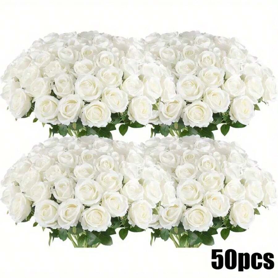 50/25/5pcs White Roses With Stems And Stems + 6 Corner Leaves - Realistic Artificial Roses For DIY Wedding Bouquets, Bridal Gifts, Table Decorations And Home Decorations, No Container Required, Wedding Decorations, Elegant Floral Combinations, Natural Rose Look
