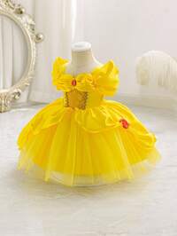 Glamorique Kids Baby GirlPrincess Tulle Dress, Yellow Mesh Princess Dress, Lace, Red Gemstone, Partywear, Red 3D Rose, Elegant Party Dress, Birthday Party, Wedding Holiday Dress, Middle East, Europe #8 Bestseller