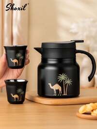 Shoxilshoxil 1PC 800ml Black Coffee Pot, Camel Coconut Tree Pattern Insulated Pot, Insulated Teapot, Kettle, Middle Eastern Style Teapot, 80ml Tea Cup, Coffee Cup, Water Cup, Double-Layer Insulated Cup, For Home, Coffee Shop, Ramadan