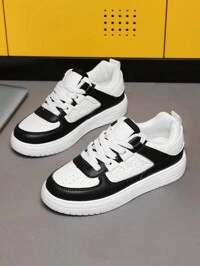 1pair Kids' Sports Shoes, Skateboarding Shoes, Indoor/Outdoor Casual Athletic Sneakers, Low Cut, Magic Sticker Closure, Easy To Wear And Take Off, Lightweight And Breathable, Anti-Slip Pu Leather Surface, Elastic And Soft, Shock Absorbing, Quick-Drying, Waterproof, Wear-Resistant, Splicing Design