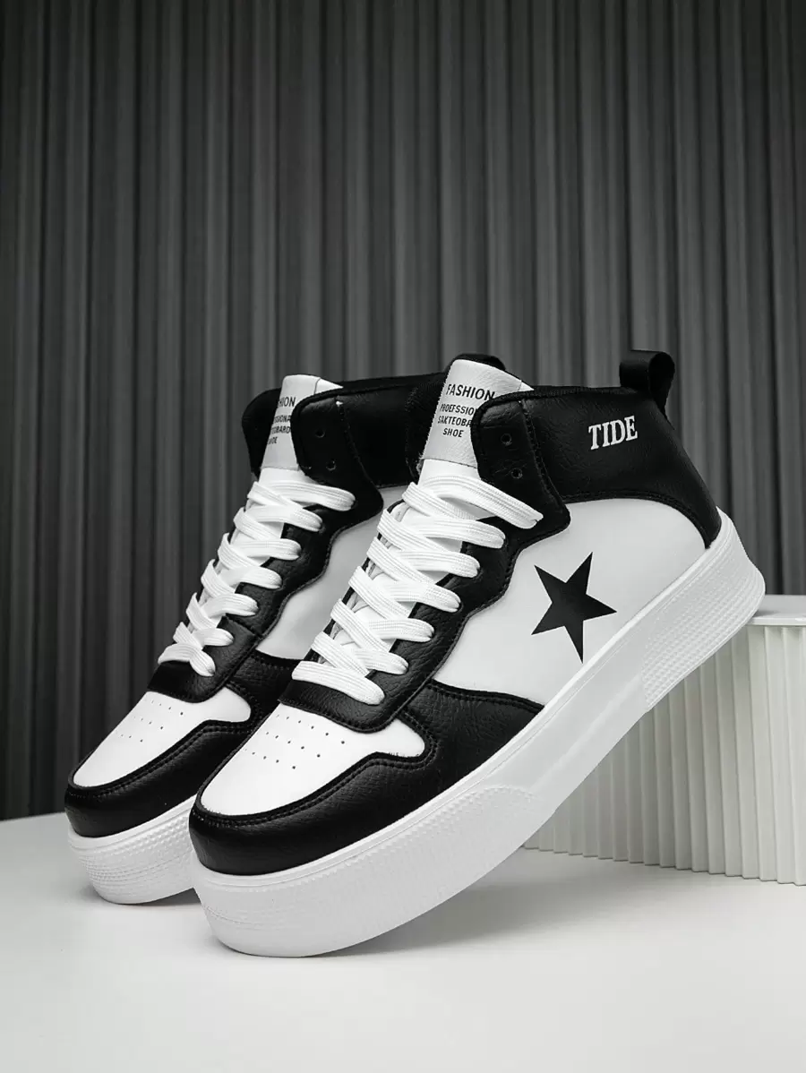 Men's Black & White Comfortable Thick Sole Shock-Absorbing High-Top Street-Style Casual Sports Shoes, Personalized Star Print Leather Upper Splicing High-End Minimalist Outdoor Non-Slip Flat Shoes