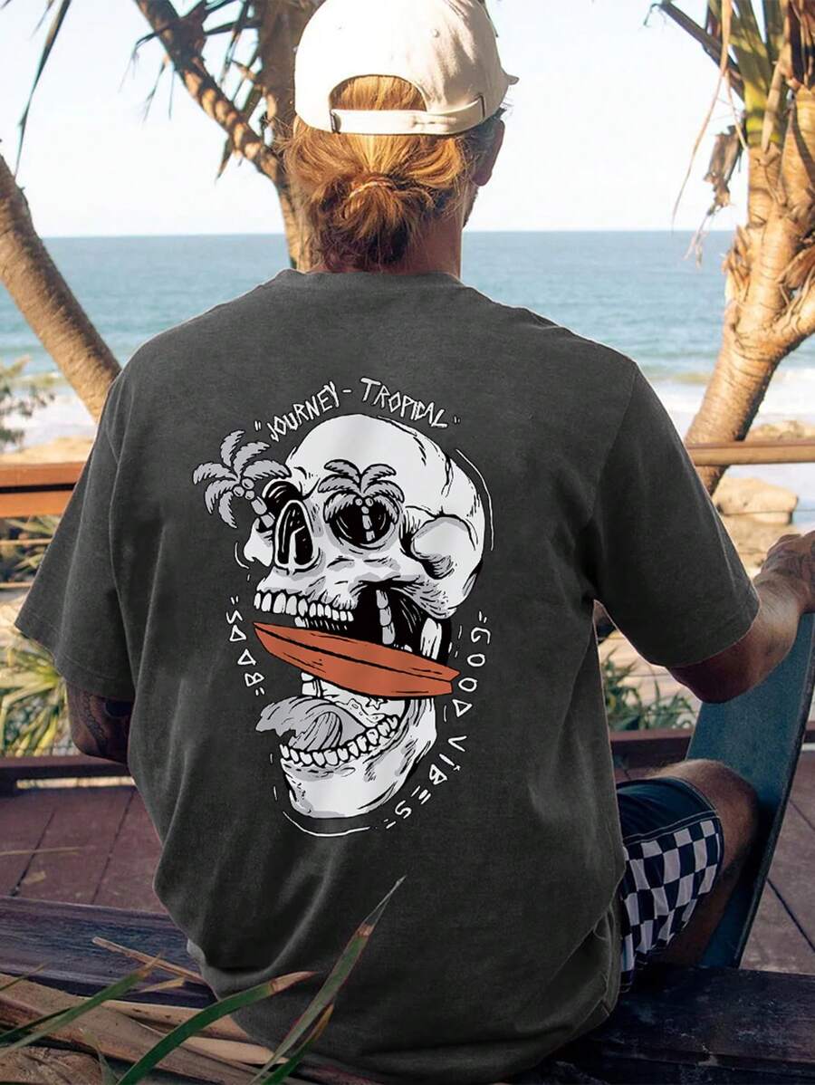 Men's Letter & Skull Graphic Round Neck Short Sleeve Casual T-Shirt, Summer, For Halloween