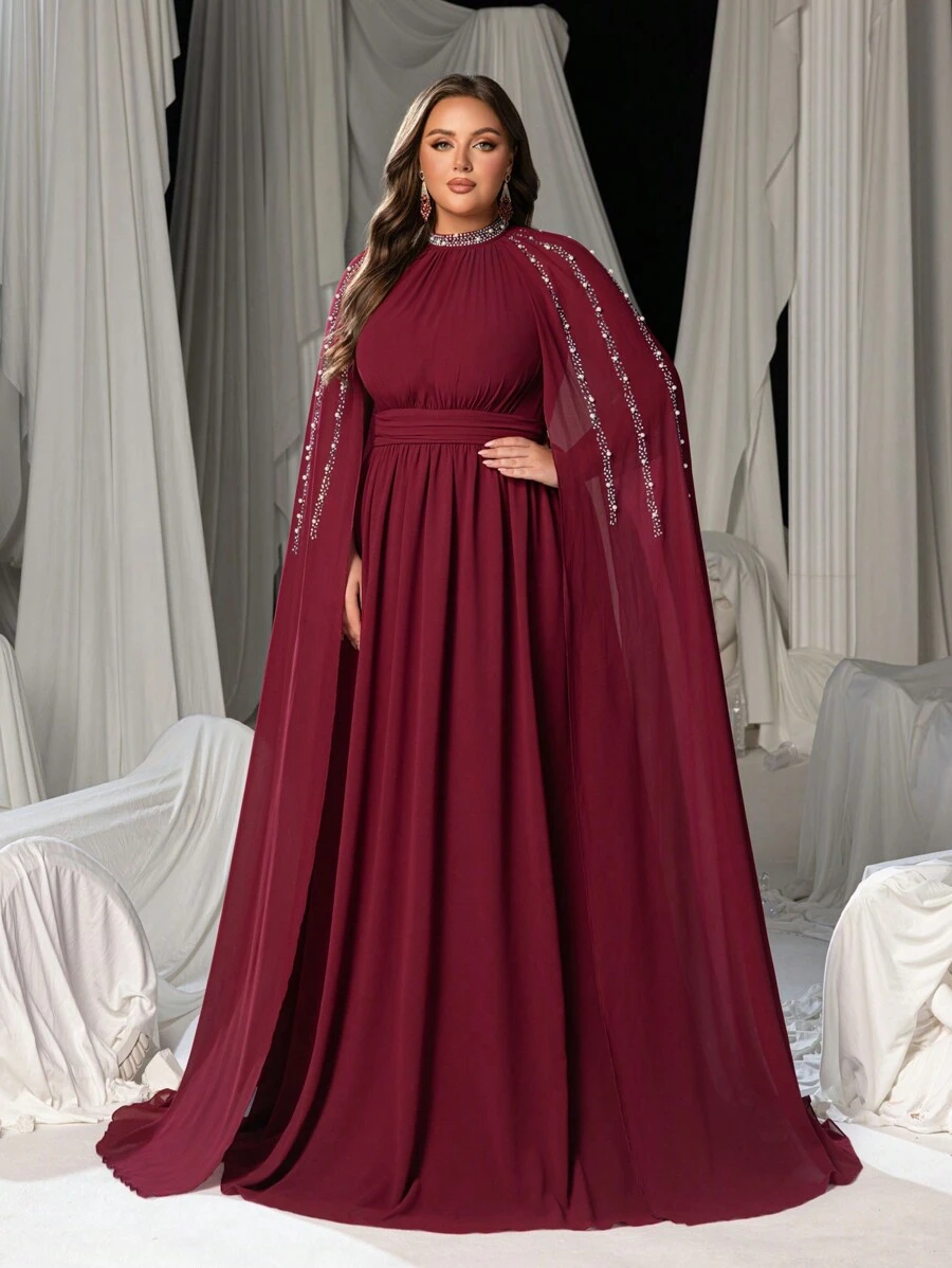 Faeriesty Plus Elegant Rhinestone Detail Mock Neck Chiffon Formal Cape Dress, Party Dress, Wedding Guest Dress, Evening Dress