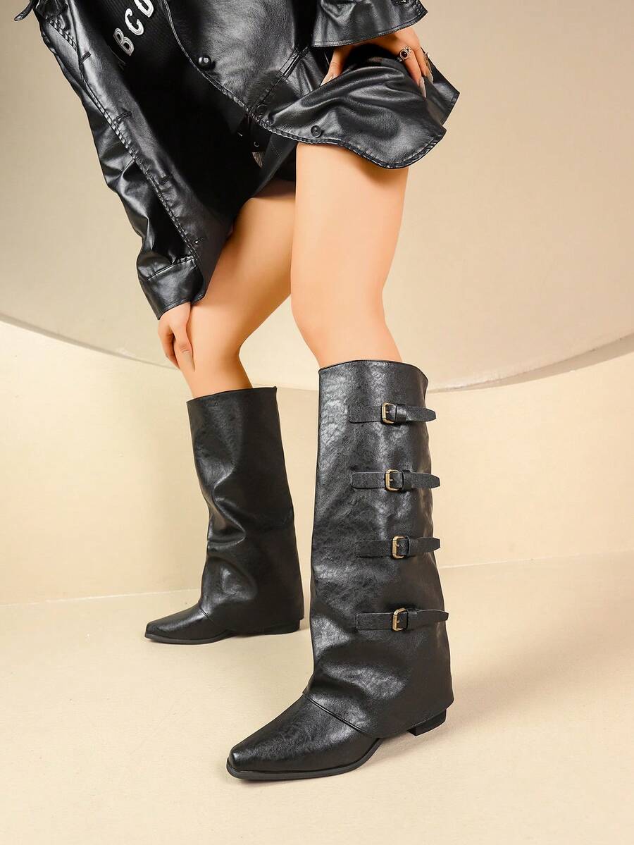 Retro High Shaft Boots, French Style Versatile Western Cowboy Boots, Knee-High Boots For Petite Women, Buckle Strap Shoes