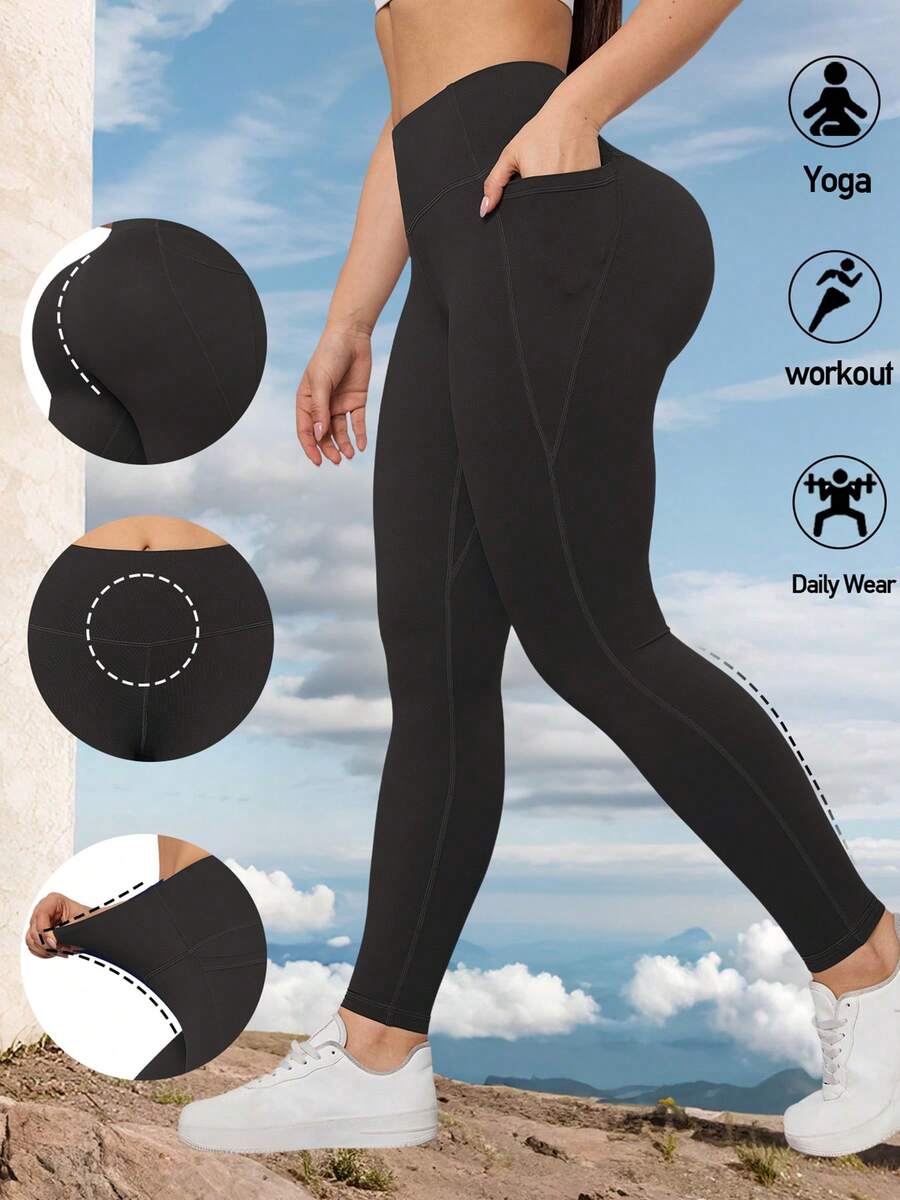 Women's Solid Color Yoga Leggings With Pockets, Butt Lifting & Tummy Control, Stretchy Workout Pants For Outdoor Fitness