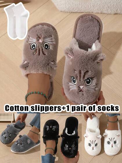 Plush Cute Cat Design Women's Home Slippers, Equipped With Portable Travel Socks, Warm Slippers For Home Girls, Comfortable And Breathable, Suitable For All Seasons, Soft And Beautiful, Indoor Shoes, Thick Soled Non Slip Home Shoes, Cartoon Lightweight Soft Soled Plush Bedroom Shoes, Autumn And Winter Slippers, Romantic Partners, Cartoon Cute Slippers For Cats, Home Warm Slippers, Indoor And Outdoor, Bedroom Living Room, Dormitory Insulation, Galentines, Puppy, Carnival