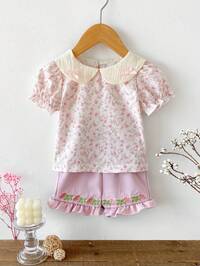 Baby Girls' Ditsy Floral Puff Sleeve Top Paired With Ruffle Hem Shorts, Lively & Casual For Everyday Wear & Outings Baby Girl Clothes Summer Baby Girl Sets Toddler Girl Summer Clothes