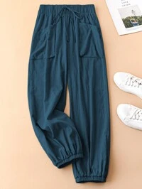 Women's Plus Size Solid Color Elastic Ankle-Length Pants, With Pockets, Zipper And Button Closure, Casual & Business Wear, Suitable For Spring, Autumn, Winter, Commuting, Daily, Holidays, Christmas, Versatile