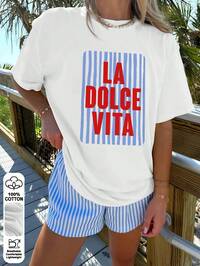 Dolce Vita Amalfi Coast Print Women's Loose-Fitting T-Shirt, Summer Top, K-Pop Warrior Series, Pure Cotton Top, Women's Apparel, Women's Summer Wear, Knitwear, Party Outfits, Plus Size Women's Wear, Plus Size Women's Round Neck Loose-Fitting Top, Best Friend Outfits, Vacation Wear, Casual Sportswear, Elegant Top, Women's Sportswear, Top Women's Wear, Promotional Women's Wear, Unisex, Teen Wear, Basic T-Shirts, Summer Women's Wear, Soft And Comfortable, Y2K Style, Spring, Summer, Valentine's Day, Carnival, Party, Beach, Wedding, Gym, Elegant, Vacation, Casual