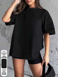 Women's Solid Color Round Neck Loose Casual Commuting Short Sleeve T-Shirt, 100% Cotton