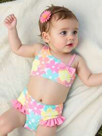 Baby Girl Vacation Beach Floral Printed Two-Piece Swimsuit Set