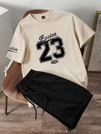 Manfinity Joysei Men's Casual Sports Letter Print Khaki Knit Top And Black Shorts, Men's Sports Suit, Suitable For Spring And Summer