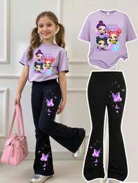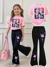 1 Set Baby Girl 0-3 Years 2Pcs Casual Chic Floral Print Short Sleeve Round Neck T-Shirt And Solid Color Bell-Bottom Pants Outfit, Suitable For Spring/Summer, Daily, Outdoor, Fashion Basic Outfits