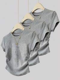 Teen Girl 3 PiecesCasual T-Shirt Ensemble, Includes Brick Red, Light Pink, And Dark Apricot Fitted Cropped Tees, Suitable For Spring/Summer, Lightweight & Comfortable For Everyday Casual Wear, Cool Summer Series