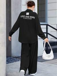 SHEIN Teen Girls' Textured Letter Print Shirt & Wide Leg Pants 2 Pieces Set, Early Autumn Transitional