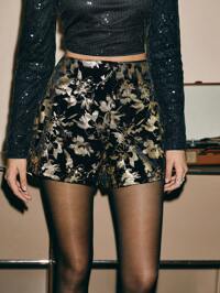 PoésellePoéselle Black Velvet Hot Gold Shorts,Vintage Printed Shorts, 2024 AW, Winter Clothes,Christmas Women Clothes,Simple Fashion, Suitable For Daily Street, Commute, Banquet, Party, Guest Clothing
