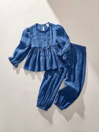 THE HAPPY LOOK Young Girls Blue Woven Fabric Round Neck Lantern Sleeve Lace Panel Flared Hem Loose Shirt And Elastic Waistband Balloon Leg Pants Set, Mori Style, Autumn/Winter