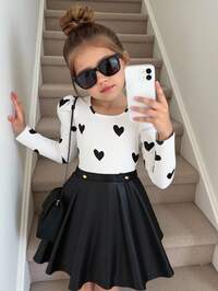VibeCozSHEIN Young Girls Tween Girl Elegant Heart Print Gigot Sleeve T-Shirt & PU Metal Button Decor Ruffle Hem Skirt 2pcs Set,Autumn Winter New Arrival,Young Girl , Daily Wear, School, Autumn & Winter,Pairing White Shirt,Back To School Season.College Style, For Christmas, Girls Winter Clothes,Christmas Clothes, Party Wear, Daily Wear School Daily, Birthday Clothes, Princess Clothes,Mom And Daughter & Sisters Matching,For Halloween. #1 Bestseller