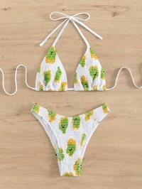 Allover Print Smocked Halter Triangle Summer Beach Bikini Set